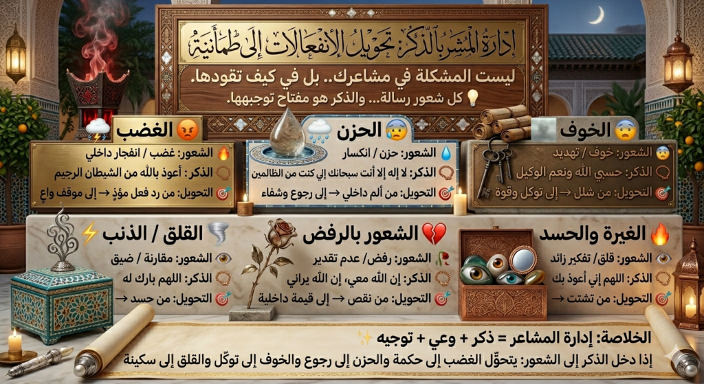 إدارة المشاعر بالذكر: حين تتحول الانفعالات إلى أبواب قرب من الله 🌿إدارة المشاعر ليست حربًا مع النفس، ولا محاولة لإطفاء ما نشعر به، بل هي فنّ تحويل كل شعور إلى جسرٍ يقودنا إلى الله بدل أن يبعدنا عنه.فالمشاعر في حقيقتها ليست مشكلة، بل رسائل…لكن الخلل يقع حين نفسرها تفسيرًا خاطئًا، أو نتصرف بها دون وعي، فنقع بين الكبت أو الانفجار أو التبرير.أما المنهج الأعمق، فهو أن نُدير مشاعرنا من خلال الذكر، لأن الذكر لا يغيّر الشعور فقط، بل يعيد توجيه القلب كله.قال تعالى:﴿أَلَا بِذِكْرِ اللَّهِ تَطْمَئِنُّ الْقُلُوبُ﴾ [الرعد: 28]فالطمأنينة ليست غياب المشاعر، بل حسن إدارتها في نور الذكر.🌩️ الغضب: من نارٍ مدمّرة إلى قوةٍ منضبطةالغضب شعور طبيعي، لكنه إن تُرك دون وعي، تحوّل إلى أذى وظلم.🔸 الذكر المناسب:"أعوذ بالله من الشيطان الرجيم"لأن الغضب لحظة اشتعال، والشيطان ينفخ فيه.فالاستعاذة هنا ليست مجرد كلمة، بل فصلٌ مباشر بينك وبين الوقود الداخلي للغضب.🔸 التوجيه:لا تُطفئ الغضب… بل أعد توجيهه نحو موقف حق دون أذى.🌊 الحزن: من انكسارٍ داخلي إلى باب مراجعة ورحمةالحزن يكشف عمق الفقد والخذلان، لكنه قد يتحول إلى استسلام إن لم يُحتوَ.🔸 الذكر المناسب:"لا إله إلا أنت سبحانك إني كنت من الظالمين"هذا ذكر نبي الله يونس عليه السلام في بطن الحوت،وهو أعظم نموذج لتحويل الضيق إلى انفتاح.🔸 التوجيه:الحزن ليس ضعفًا… بل فرصة للعودة، للتطهر، ولمراجعة النفس.🌫️ الخوف: من شللٍ داخلي إلى يقظة واعيةالخوف قد يشل الإنسان، أو يجعله يهرب من الحياة.🔸 الذكر المناسب:"حسبي الله ونعم الوكيل"هذا الذكر يعيد ترتيب الداخل:من الاعتماد على الأسباب فقط → إلى التوكل على الله.🔸 التوجيه:الخوف لا يُلغى… بل يُعاد توجيهه ليصبح حذرًا لا شللًا.🔥 القلق: من استنزافٍ ذهني إلى تسليم داخليالقلق هو تفكير زائد في المستقبل مع شعور بالعجز.🔸 الذكر المناسب:"اللهم إني أعوذ بك من الهم والحزن"هذا الدعاء النبوي يجمع بين الاستعاذة من الألم النفسي والتشتت الداخلي.🔸 التوجيه:القلق يُهدّأ حين يعود العقل إلى الحاضر، والقلب إلى الله.💔 الشعور بالرفض: من جرحٍ داخلي إلى استعادة القيمةهذا من أعمق الجراح، لأنه يضرب الإحساس بالذات.🔸 الذكر المناسب:"إن الله معي، إن الله يراني"كما قال تعالى:﴿إِنَّ اللَّهَ مَعَنَا﴾ [التوبة: 40]🔸 التوجيه:حين تشعر أنك مرفوض من الناس، تذكّر أنك مرئي من الله… وهذا يعيد بناء قيمتك من الداخل.⚡ الشعور بالذنب: من جلد الذات إلى توبة واعيةالذنب إن لم يُفهم، يتحول إلى جلدٍ للنفس أو هروب.🔸 الذكر المناسب:"أستغفر الله وأتوب إليه"🔸 التوجيه:الاستغفار ليس فقط طلب مغفرة، بل تحرير من ثقل الماضي.🌪️ الغيرة والحسد: من مقارنة مدمّرة إلى رضا داخليهذا الشعور يفسد القلب إن تُرك دون تهذيب.🔸 الذكر المناسب:"اللهم بارك له"🔸 التوجيه:حين تدعو بالبركة لغيرك، تكسر دائرة الحسد، وتعيد قلبك إلى الرضا.✨ الخلاصةإدارة المشاعر الحقيقية ليست في السيطرة عليها فقط، بل في توجيهها نحو الله.فكل شعور هو باب:إما أن يقودك إلى الفوضىأو يقودك إلى القربوالفرق ليس في الشعور…بل في كيف تتعامل معه.فإذا دخل الذكر إلى الشعور، تحوّل الألم إلى وعي،والخوف إلى توكل،والحزن إلى رجوع،والغضب إلى موقف،والإنسان من عبدٍ لمشاعره… إلى عبدٍ لله يقودها بنور البصيرة.